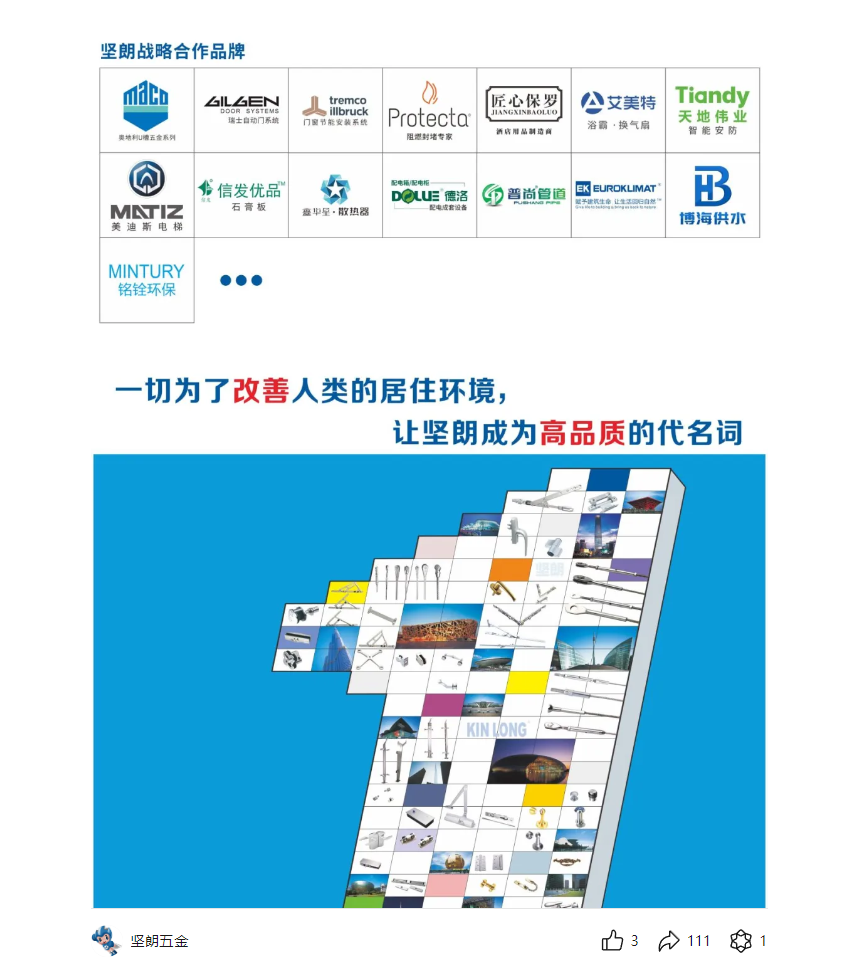 堅(jiān)朗五金作為一家A股上市公司,是建筑行業(yè)領(lǐng)先的配套集成供應(yīng)商。堅(jiān)朗生產(chǎn)基地建筑面積超過90萬㎡,公司員工總數(shù)超過16000人,60多家子公司。公司在國(guó)內(nèi)外設(shè)有近1000個(gè)銷售服務(wù)機(jī)構(gòu),產(chǎn)品遠(yuǎn)銷100多個(gè)國(guó)家和地區(qū)。經(jīng)過多年的發(fā)展,堅(jiān)朗已成為建筑領(lǐng)域的著名品牌。